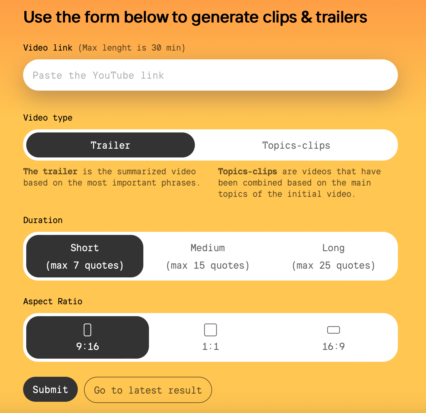 One tool that simplifies clip selection using AI is AI Video Cut, an online solution powered by OpenAI technology. With AI Video Cut, you simply link to your video, choose the desired output type, and let the AI do the rest.