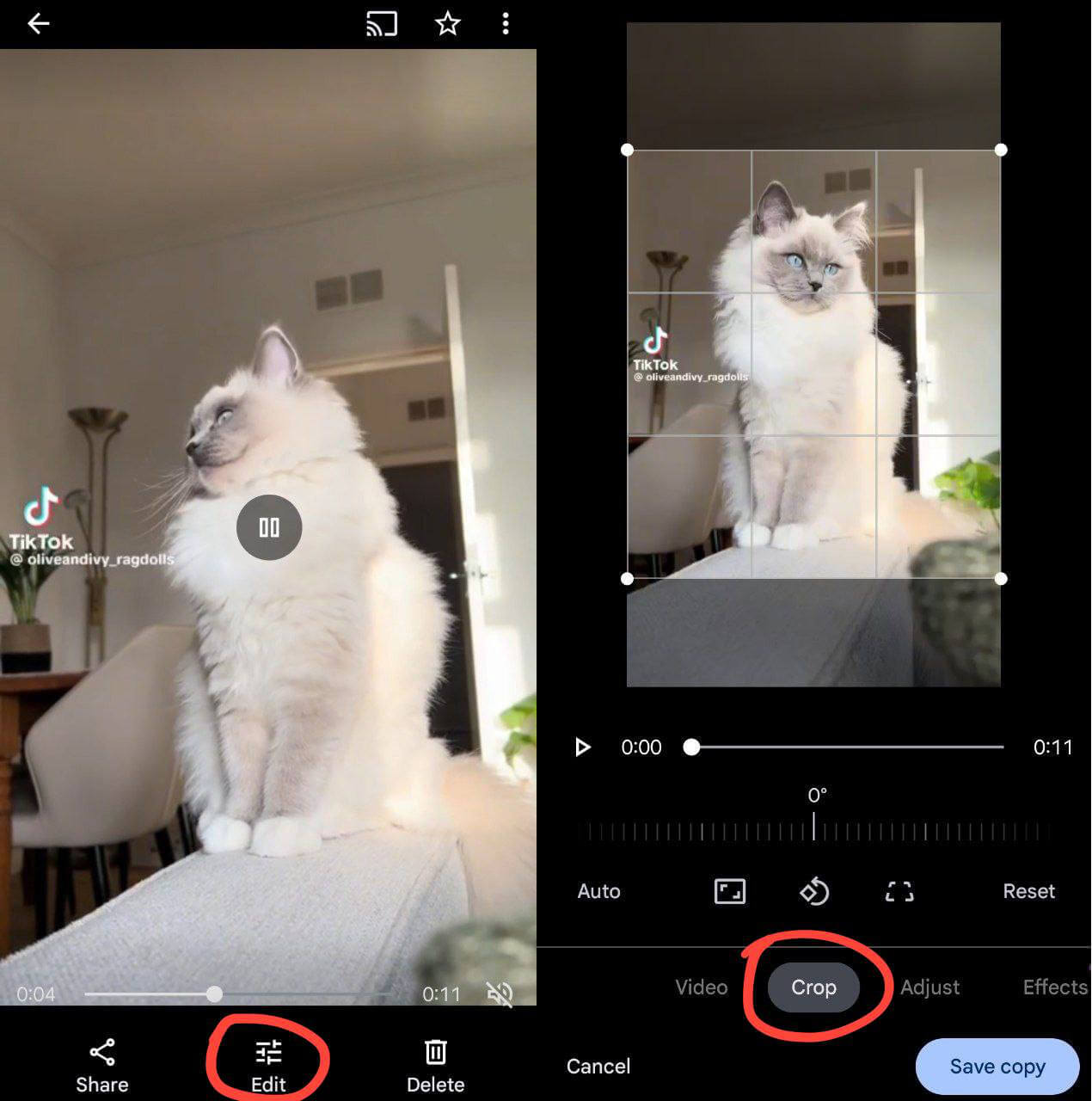 - Tap on “Save copy,” and your cropped video will appear in the Gallery and Google Photos apps.