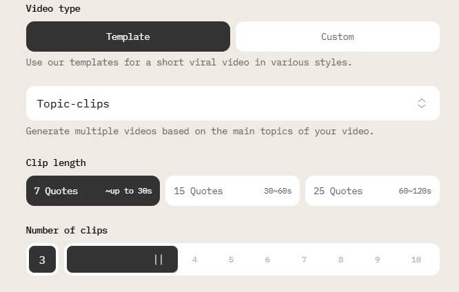 - Select the number of clips you want to get and their length.