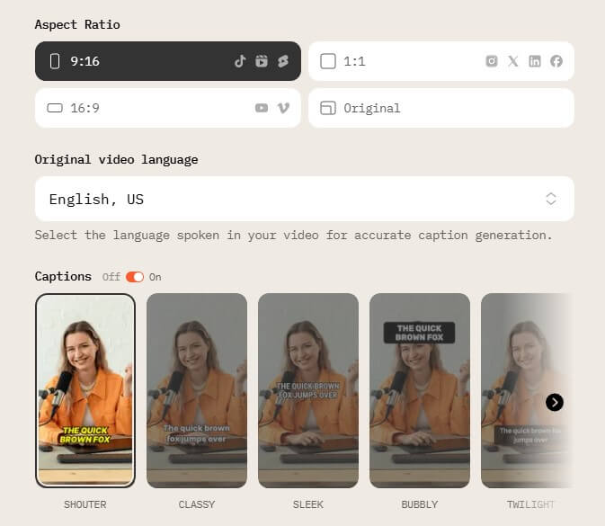 - Select the aspect ratio and language if you want to auto-caption your video.