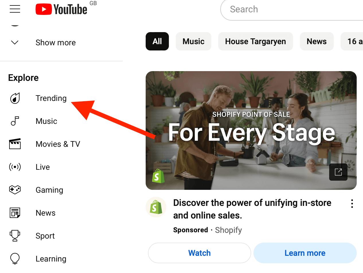 To grasp what’s trending on YouTube, you can use tools like Google Trends, the research tab in YouTube analytics, or visit the Trending tab on YouTube. However, note that the latter method isn’t always trustworthy because some brands and creators buy bot viewers and comments to artificially grow their channels.