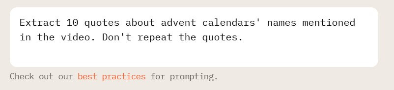 Remember to add simple conditions such as “Don’t repeat the quotes” and experiment with the prompts so you get the result you aim for. Let’s see an example in action. We wanted to create a teaser video with an advent calendar review that contains all the calendar brands mentioned in the video. We decided that 8 quotes would be enough, then we specified that the quotes should be about the brand names, and finally, we added a condition that quotes should not be repeated. Here is how the custom prompt looked in the end: