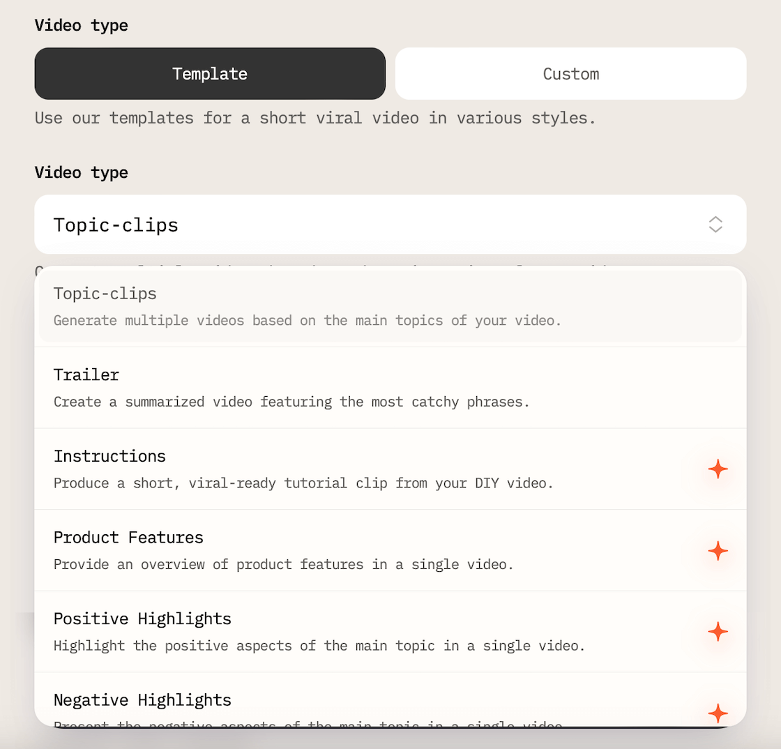 Want to turn an hour-long product review into several short snippets? Opt for Product Features. Looking for a way to create a short DIY or a how-to video based on your lengthy YouTube tutorial? AI Video Cut has got you covered with its Instructions prompt. Simply need to create multiple videos at a time from a longer clip? Choose Topic Clips.