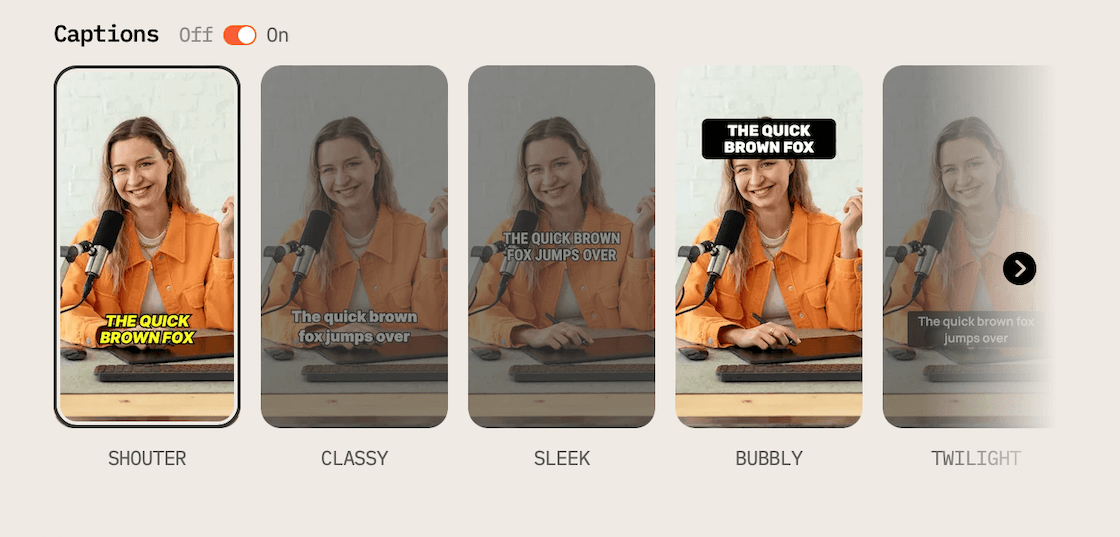 - Turn on captions and select your preferred style for them if you want to add them to your video. For better accuracy, pick the language manually. If your clip already has captions, turn off this setting.